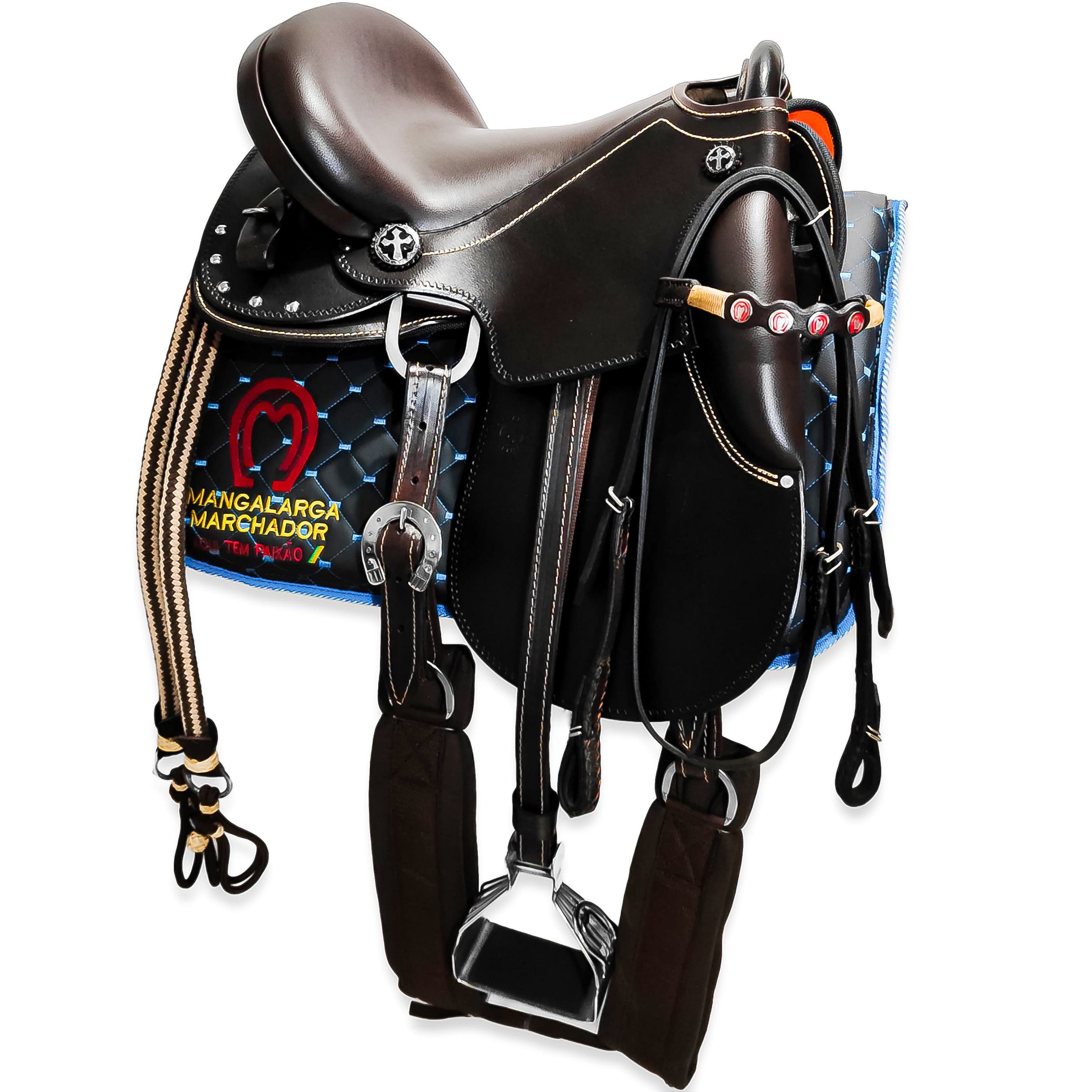 Apresentamos esta sela mangalarga, feita com couro de búfalo de excelente qualidade. Ela possui uma armação aberta perfeita para os cavalos mangalarga e das mais variadas raças, além da espuma D60 e ferragens em aço inoxidável, que garantem muito conforto e durabilidade.